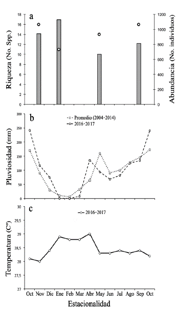 En diferentes localidades del Cinturón Árido Pericaribeño y del Neotrópico se ha obtenido una mayor riqueza y abundancia en muestreos realizados en época de lluvias que en época seca (Andresen 2005, Andrade et al. 2011, Liberal et al. 2011, Navarro et al. 2011, Medina y Lopes 2014, Iannuzzi et al. 2016, Noriega et al. 2016, Rangel-Acosta et al. 2016a, b), en oposición a nuestros resultados ya que la mayor abundancia se obtuvo cuando se registró una menor incidencia de lluvias y la menor abundancia se registró cuando la precipitación aumentaba. Este mismo resultado fue registrado por Ibarra-Polesel et al. (2015) quienes creen que es la temperatura y no la pluviosidad la variable que más influye en la estructura de los ensamblajes. Estas diferencias pueden también atribuirse a que las fuertes precipitaciones ocasionan la pérdida y disolución del recurso (Howden y Young 1981). No obstante, algunos estudios proponen que el cambio de la abundancia y estructura de la comunidad de escarabajos coprófagos en bosques secos están ligados a la precipitación (Andresen 2005, Navarro et al. 2011). Igualmente, esta variación estacional puede estar relacionada con una asincronía que permite la coexistencia de las especies al disminuir la competencia (Hanski y Cambefort 1991). A pesar de todo lo anterior, al tener una única repetición por estación es muy difícil aseverar que los resultados encontrados obedecen exclusivamente a un patrón estacional y no son variaciones asociadas a la dinámica poblacional.