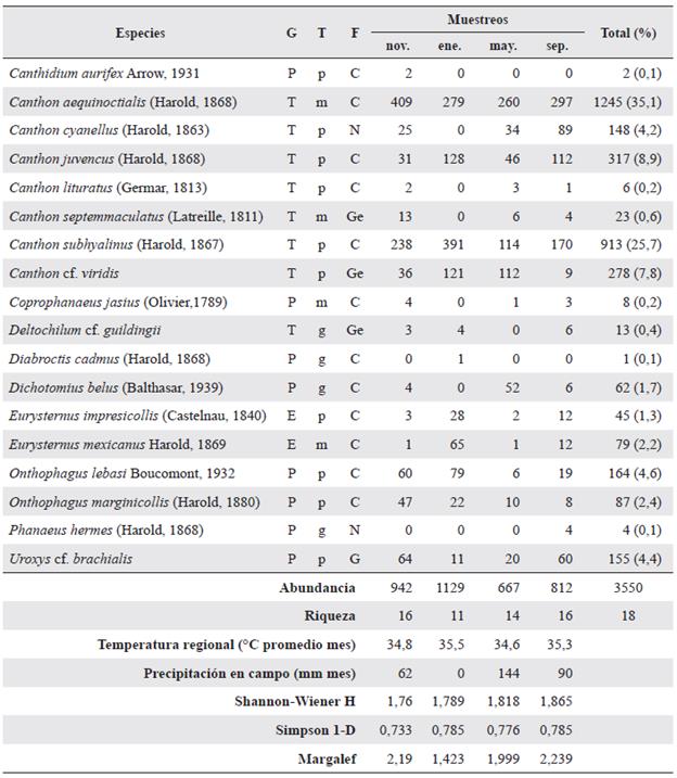 Por otra parte, las especies Coprophanaeus jassius (Olivier, 1789), Canthidium aurifex Arrow, 1931 y Diabroctis cadmus (Harold, 1868) presentaron abundancias muy bajas (Tabla 1). La mitad de las especies se agrupó como especies siempre presentes y solo tres (16,6 %) fueron exclusivas de un solo muestreo (C. aurifex en noviembre 2015, D. cadmus en enero 2016 y C. jassius en septiembre de 2016) (Tabla 1).