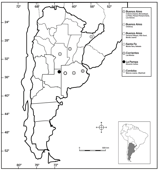 Material examined: ARGENTINA. BUENOS AIRES: General Villegas 35°02'00" S, 63° 01'00'' W, Villa Saurí 37°7'0.12" S; 62°58'59.87'' W and Benito Juárez (37°49'00'' S, 57°49'00'' W. LA PAMPA: Eduardo Castex 35°54'S; 64°18' W and Santa Rosa 36°37' 13''S, 64°17'26'' W.