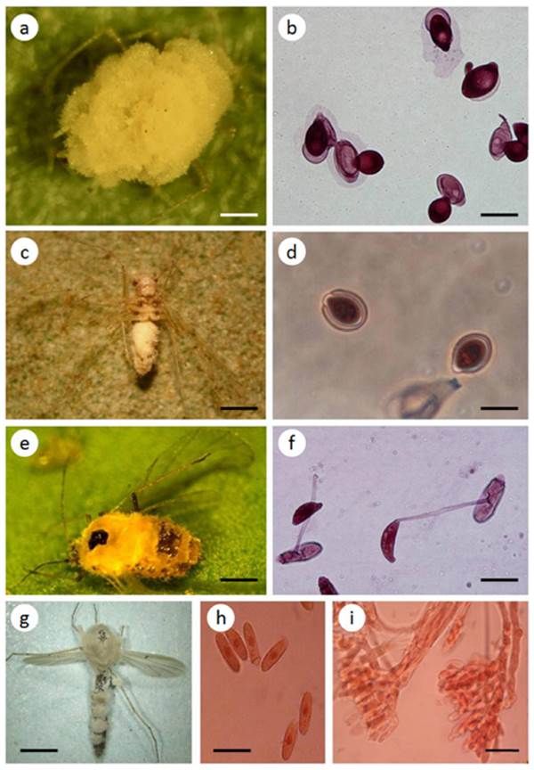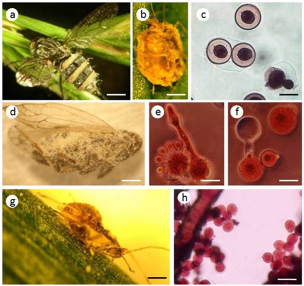 Hosts: Hemiptera Aphididae, several species (Figs. 3e, f). Culture collection accession numbers ARSEF 7208, ARSEF 7455, ARSEF 7788, ARSEF 7789. A.C. Scorsetti, R.G. Manfrino, (LPSC 47467, LPSC 47460).
