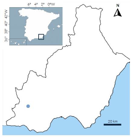 Figura 1: Localización del punto de muestreo (círculo) en Almería, España.