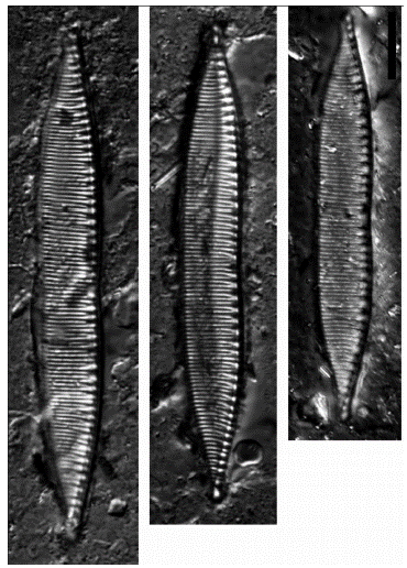 Descripción. Valvae leniter dorsiventrales marginibus dorsalibus ventralibusque fere rectis sed in media, de-pressio exigua adest Apices protractae rostrataeque ad subcapitatae vel capitatae. Longitudo 60-82 μm (701 ± 68 μm), latitudo 8-10 μm (89 ± 08 μm), ratio 67-94 μm (77 ± 08 μm). Fibulae carinae raphis, 6-8 (71 ± 08) in 10 μm, fere aequidistantes, mediis duabus conspicue magis remotis inter se. Una fibula continens variabiliter cum 2-3 costis transapicalibus. Fines proximi interni exter-nique ramorum raphis non interrupti Striae transapica-les parallelae omnino, 13-16 (141 ± 08) in 10 μm. Puncta striarum non aspectabilia microscopio photonico, circa 30 in 10 μm.