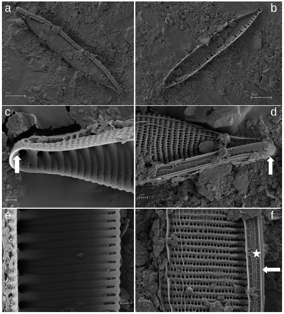 Figura 3: Hantzschia gadorensis sp. nov. Individuos del especimen holotipo (MEB). a Valva en visión externa; b Valva en visión interna; c Ápice en visión interna, mostrando la helictoglosa (flecha); d Ápice en visión externa, mostrando la fisura terminal del rafe (flecha); e Centro valvar en visión interna; f Centro valvar en visión externa. La flecha indica la posición del canal rafidiano, flanqueado por un estrecho conopeo (estrella).