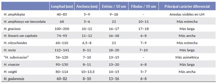 Diagnosis diferencial. Las citadas características ul-traestructurales permiten diferenciar fácilmente esta nueva Hantzschia de otras especies similares, siendo posible la discriminación incluso en microscopía óptica. Los parámetros morfométricos de esta nueva especie se solapan con los encontrados por Lange-Bertalot et al. (2003) en una población de "Hantzschia subvivacior" (nombre no validado) en la isla de Cerdeña, siendo la forma de la valva consistentemente más estrechos (7-8 vs. 8-10 μm en H. gadorensis). La similar H. compactoides Lange-Bert. es, por el contrario, más ancha (10-12 μm) Hantzschia vivacior Lange-Bert. y H. graciosa Lange-Bert. presentan valvas mucho más alargadas que H. gadorensis, con un cociente largo/ancho que no se solapa con las medidas de la especie descrita. Finalmente, la combinación de caracteres en otras Hantzschia con dorsiventralidad poco acusada (e.g. H. amphilepta (Grunow) Lange-Bert., H. amphioxys var. lanceolata McCall, H. linearis var. capitata Gandhi, H. recta Gandhi non G.W.Andrews o H. voigtii Gandhi) es también diferente (Tabla 1), lo que confirma a H. gadorensis como novedad taxonómica.