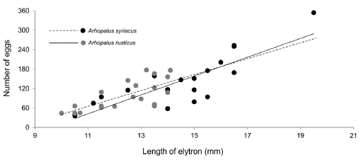 In both species, we found a significant positive relationship between female size and the number of eggs carried (Table 1, Fig. 1). Interaction between species and the female elytron length was not significant (Table 1). Female size had no significant effect on egg morphometric characteristics (L, W, E or V) in either species (Table 2). Females were significantly larger in A. rusticus than in A. syriacus (Table 3). We also found statistically significant differences in egg morphometric characteristics, with the eggs of A. rusticus being larger than those of A. syriacus (Table 3), but there was no significant difference between the species in the number of eggs in ovaries (Table 1).