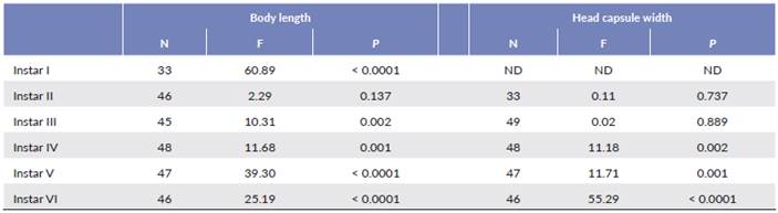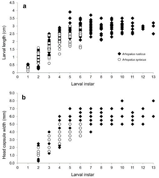 Larval rearing started with 131 individuals of A. rusticus and 100 of A. syriacus. Each was observed daily until the instar in which the first pupa was observed, to register the development time in days. The first larval instar or larval instar I was considered as the period of time in days from egg hatching to the first molt, the second larval instar or larval instar II was considered as the period of time in days from the appearance of the larva instar I until the next molt, and so on for each instar. Larval length (cm) and exuvia head capsule width (mm) were recorded when each molted from one larval instar to the next one. Exuvia head capsule widths, as well as larval length, were measured using a caliper (with 0.1 mm accuracy). If the head capsule exuviae could not be found, but the larva had molted, as evidenced by an incompletely sclerotized head, only the larval body length was measured.