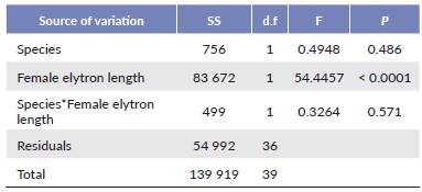 Table 1: Results of ANCOVA using species and female elytron length as covariates and the number of eggs in the ovaries as dependent variable.
