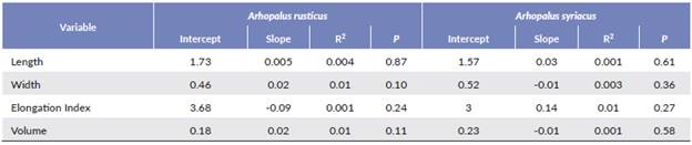 Table 2: Regressions between female body size of Arhopalus rusticus and Arhopalus syriacus and morphometric characteristics of the eggs. None were significant.