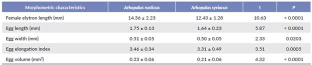 Table 3: Female elytron length and egg morphometric characteristics in Arhopalus rusticus and Arhopalus syriacus (mean ± SE), and results of t test.