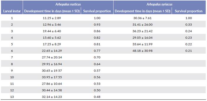 Survival was statistically higher in A. rusticus than in A. syriacus (Logrank χ2 = 44.794, P < 0.001) because the survival of A. syriacus showed a sharp fall in the early stages of larval development i. e. larval instars one and two (Table 5).