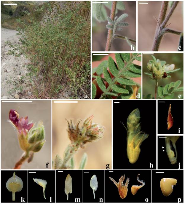 a. Hábito; b. Hojas jóvenes; c. Estípulas; d. Detalle de la hoja por el haz; e. Inflorescencia con flores blancas; f. Inflorescencia con flores moradas; g. Infrutescencia. h: Flor, vista lateral; i. Bráctea; j. Detalle de la inserción la columna estaminal en los pétalos; k. Vista frontal del estandarte; l. Vista lateral del estandarte; m. Ala; n. Pétalo de la quilla; o. Cáliz (izq.) y fruto; p. Semilla. Escalas: a = 20 cm; b, d-g = 1 cm; c = 2 mm; h-p = 1 mm.