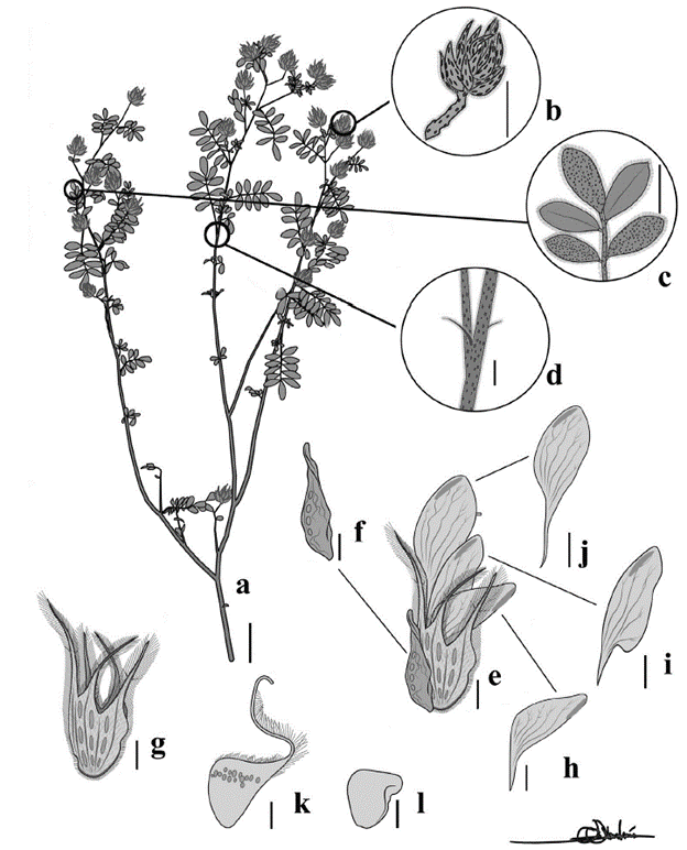 a. Hábito; b. Inflorescencia; c. Detalle de la hoja por la haz; d. Estípula; e. Flor, vista lateral; f. Bráctea; g. Cáliz; h. Estandarte; i. Ala; j. Pétalo de la quilla; k. fruto; l. Semilla. Escalas: a = 3 cm; b y c = 1 cm; d = 2 mm; e-L = 1 mm.
