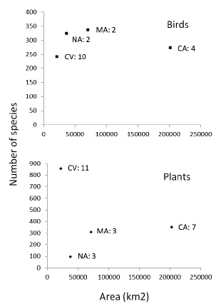 Figure 2: Number of species of birds and plants as a function of the remnant area of dry tropical forest in four regions of Colombia (data for remnant forest taken from García et al. 2014). CV = Cauca Valley, NA = NorAndean region, MA = Magdalena Valley and CA = Caribbean region. The number of inventories per region is shown.
