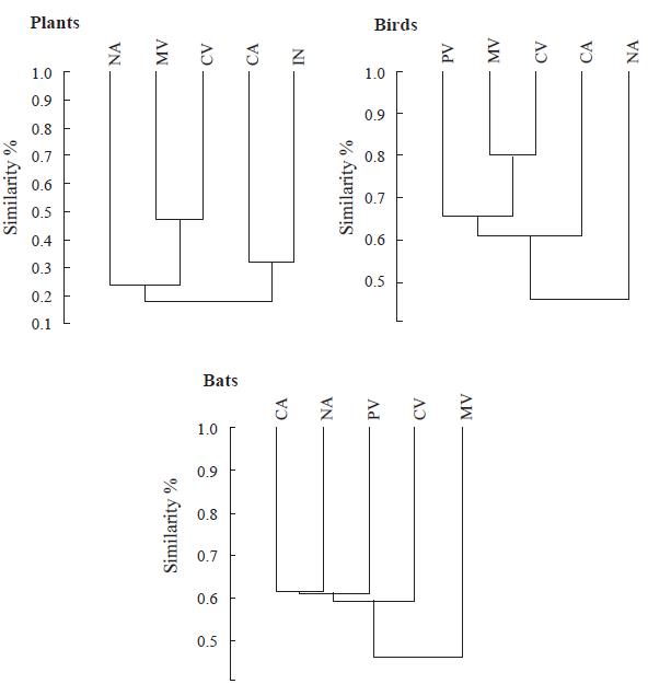Figure 3: Analysis of similarity in species composition among regions of dry forest in Colombia for plants, birds and bats using the Simpson index. CV= Cauca Valley, MV = Magdalena Valley, PV = Patía Valley, CA = Caribbean, NA = NorAndean and IN = Insular.