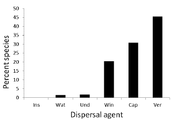 Figure 4: Distribution of plant species according to dispersal agent in Colombian dry forest. INS = Insects, WAT = Water, UND = Undefined, SPP = Spores, WIN = Wind, CAP = Capsular, VER = Vertebrates.