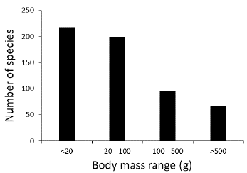 Figure 5: Distribution of number of species of frugivorous birds in ranges of body mass for the Colombian dry forest.