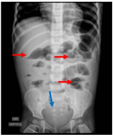 Fig 1: Plain abdominal x-ray (red arrows). Absence of distal gas (blue arrow); air-fluid levels (red levels).