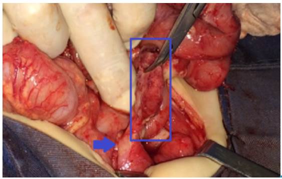 Fig 2: Stump appendicitis, intraoperative findings. The length of the stump, which is greater than 1 cm (blue square), and the cecum (blue arrow) can be seen.