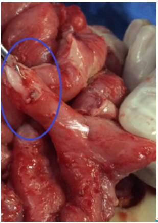 Fig 3: Meckel's diverticulum (blue circle). Intraoperative findings.