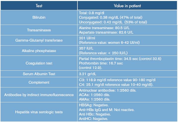 The diagnosis considered limited systemic scleroderma, with the possibility of primary biliary cirrhosis overlap as the cause of intra-hepatic cholestasis; immunological tests were performed to confirm a common autoimmune disorder. Also, serum complement levels were measured, showing normal values, which helped ruling out other conditions characterized by complement consumption (C3: 118.9 mg/ dl. Reference value: 90-180 mg/dl; C4: 25.1 mg/dl. Reference value 10-40 mg/dl).