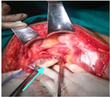 An exploratory laparotomy was decided with conventional appendectomy plus raffia with appendicular base, similar to the Parker-Kerr technique. Findings included appendiceal tumors with a wide base of thick walls and mucoid content. The samples taken were sent to pathology (Figure 2).