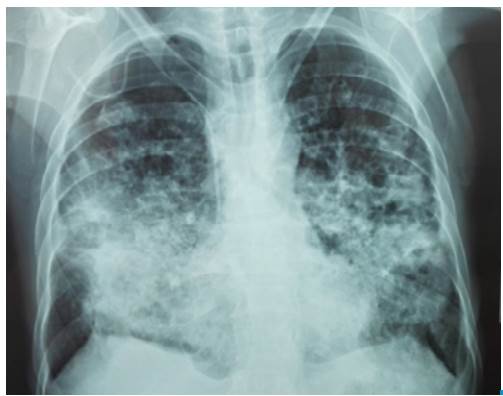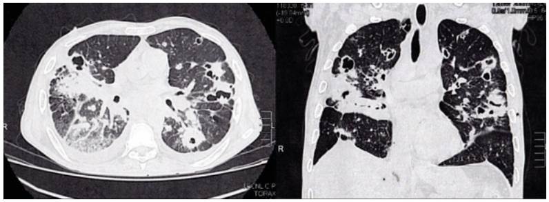 Figure 1: Chest x-ray with abundant alveolar opacities in both lung fields with formation of pneumatoceles.
