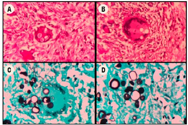 Figure 3: Lung histopathology. A and B: periodic acid-Schiff (PAS) staining; C and D: coloration with methenamine silver stain (GMS) corresponding to P. brasiliensis.
