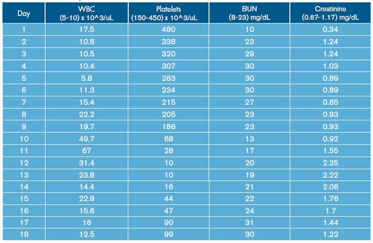 Similarly, leukocytosis, progressive thrombocytopenia and deterioration of renal function were documented (Table 1). Blood gas tests were made, showing hypoxemia with hypercapnia associated with mixed acid-base disorders due to normochloremic metabolic acidosis, metabolic alkalosis and respiratory alkalosis (Table 2).