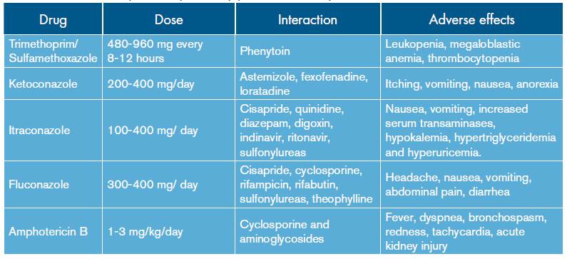 Although PCM is an endemic entity with high incidence and mortality, few studies have been carried out to define the appropriate therapeutic option 15. In addition, both the adverse effects and the interaction of medications that may affect its effectiveness must be considered 10.