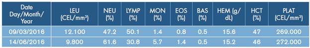 LEU: leukocytes; NEU: neutrophils; LYMP: lymphocytes; MON: monocytes; EOS: eosinophils; BAS: basophiles; HEM: hemoglobin; HCT: hematocrit; PLAT: platelets; CEL: cells. Source: Own elaboration based on the data obtained in the study.