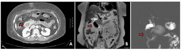 Figure 1: A) Three-phase computed tomography of the abdomen in venous phase; B) and C): T2-weighted SPAIR magnetic resonance cholangiography.