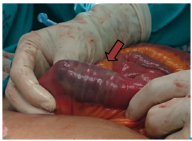 The patient underwent surgery, during which the abdominal cavity was approached by exploratory laparotomy, observing a plastron in the gallbladder topography that involved the greater omentum, the duodenum and the hepatic flexure of the colon. An exploration was made from the angle of Treitz to the duodenum, palpating a 10x5cm stone tumor, which was manually taken to the jejunum at 50cm from the Treitz angle (Figure 2).