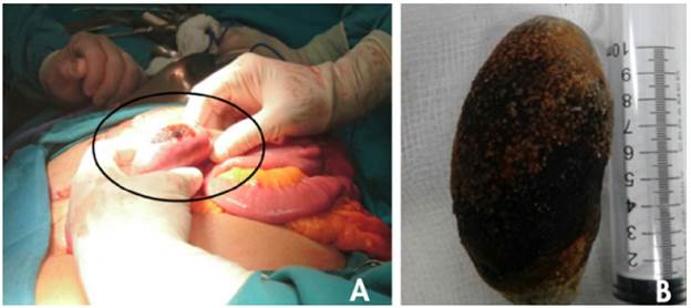 Figure 3: A) Enterotomy parallel to the major axis of the stone (circle); B) Extraction of the biliary stone, with dimensions of 10x5cm.