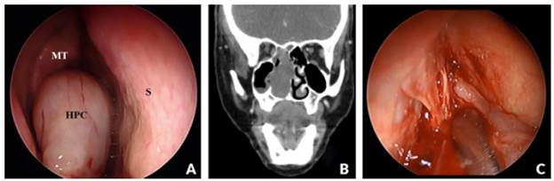 Figure 1: (A) Rhinoscopy: Obstructive mass originating from the roof of the right nasal fossa. HPC - Hemangiopericytoma, S -Nasal Septum, MT - Middle Turbinate; (B) CT paranasal sinuses in soft tissue window (coronal); (C) endoscopic surgery.