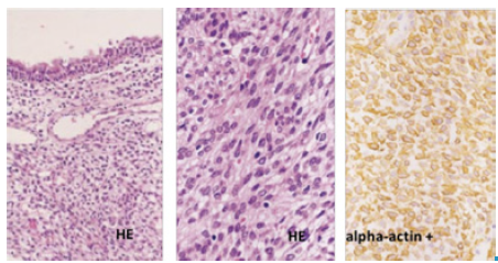 Figure 2: Anatomopathological study: Polyp lined by respiratory epithelium, expanded chorion by proliferation of cells of elongated nuclei, sometimes fusiform in appearance. Immunoreactivity for vimentin, CD34 and alpha-actin. Characteristics suggestive of sinonasal hemangiopericytoma. HE -Hematoxylin-Eosin.