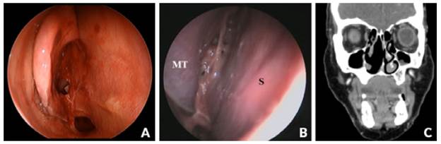 Figure 3: (A) After removing hemangiopericytoma; (B) Endoscopic examination without evidence of local recurrence (3-year follow-up). MT - Middle Turbinate; S- Nasal Septum; (C) CT paranasal sinuses in soft tissue window (coronal) - 3-year follow-up.