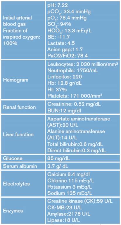 Physical examination showed blood pressure of 90/50 mmHg, mean blood pressure of 63 mmHg, heart rate of 100 beats per minute, respiratory rate of 30 breaths per minute, SpO2 of 89%, Glasgow Scale of 3/15, brain stem reflexes, mydriatic pupils, intercostal retractions, rhythmic heart sounds, rhonchi and bilateral basal rales, abdomen with diminished peristaltic-wave contractions, soft and depressed, without masses or peritoneal irritation data, and without pathological reflexes or murmurs. Paraclinical tests were requested and the results are presented in Table 1.
