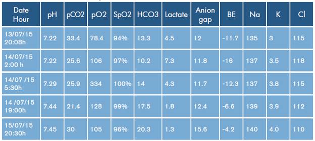 Given the patient's neurological status, rapid intubation sequence was performed in the emergency room; she presented a convulsive crisis with generalized tonicclonic seizure, controlled with diazepam 5mg IV. Arterial blood gases on admission showed mixed disorder: normal anion gap metabolic acidosis plus acute respiratory acidosis associated with hyperlactatemia type A; said hyperlactatemia is considered secondary to hypoperfusion subsequent to initial hypotension.