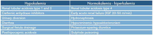 Other reviews state that renal tubular acidosis type 4 can be caused by limited sodium reabsorption and decreased secretion of hydrogen and potassium in the distal tubule leading to normal anion gap metabolic acidosis, hyponatremia, hyperkalemia and low urinary ammonium concentrations. 3,7 This condition occurs in patients with obstructive uropathy, interstitial tubule diseases, diabetic nephropathy and users of potassium-sparing diuretics. It is common to see a slight decrease in the concentration of bicarbonate, but there are reports in the pediatric and adult population of concentrations of 10 mEq/L. 3,8 The differences between the different types of renal tubular acidosis are summarized in Table 5.