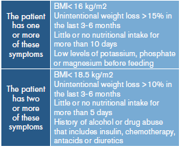 Table 1: Criteria to determine people at high risk of developing refeeding problems BMI: body mass index.