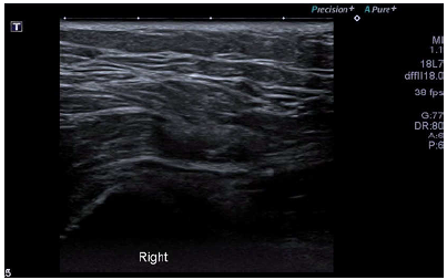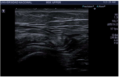 Two years after the onset of the symptoms, the patient required an arthroscopy, so a T-shaped incision of the ITB was made in the right hip using radiofrequency. During a second surgery, an X-shaped incision was made in the fasciae latae muscle on the left side, also by radiofrequency, with subsequent formation of a rhombus and fixation. The patient presented recurrence of predominant symptoms in the right hip. A control ultrasound was performed again, showing greater tendon thickening and peritendinous fluid, probably of post-surgical origin (Figure 4) (Video 2).