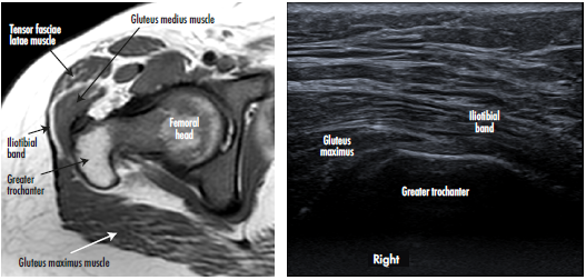 Figure 1: Magnetic resonance and ultrasound (cross-sectional plane) of the right hip of an asymptomatic patient, where the relationship between the iliotibial band, the tendon of the gluteus maximus and the greater trochanter is evident.