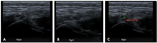 Figure 2: Dynamic ultrasound of the iliotibial band over the greater trochanter. A) neutral position of the right hip; B) hip internal rotation; C) thickening of the iliotibial band measured in the transverse plane associated with heterogeneous echogenicity of the tendon.