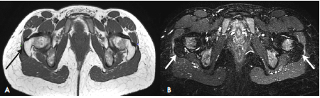 Figure 3: Magnetic resonance imaging. A) Enhanced axial T1-image showing slight thickening and undulation of the right iliotibial band (black arrow); B) axial plane with Short tau inversion recovery sequences, where an increase in signal intensity of the iliotibial band is identified on both sides (white arrows).