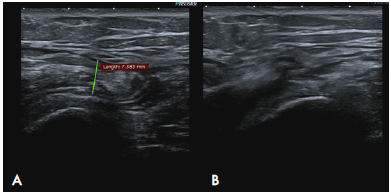 Figure 4: Ultrasound of the patient taken during post-surgical control 1 month after iliotibial band release. Persistence of symptoms. A) Increase in the thickness of the right iliotibial band (7.5 mm) with respect to the initial ultrasound. B) Dislocation of the iliotibial band during hip external rotation.