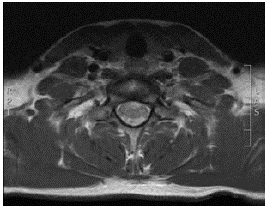 Figure 1: Contrast magnetic resonance imaging (MRI) of the cervical spine (axial plane) that shows spinal cord injury involving anterior horns with abnormal contrast uptake and contrast uptake of the roots, mainly anterior C5, C6, C7 and C8.