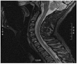 Figure 2: Contrast nuclear magnetic resonance of the cervical spine (sagittal plane) that shows chronic changes in signal intensity and malacia in the anterior cords from level C2 to level C4.