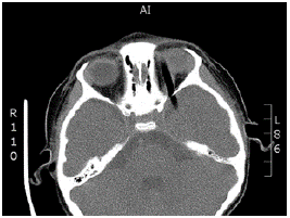 The tomography showed an intraorbital route of the foreign body towards the right side, and above the left eyeball towards the temporal lobe; no intraconal or intraocular lesions were evident, and no intracranial, subdural or epidural hematomas or retroconal bleeding were observed (Figures 1 and 2).