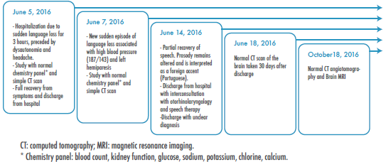 In 2016, the patient presented with a sudden clinical picture of language loss and prosody compromise, with an accent that was recognized as "foreign". The woman was initially treated with speech therapy without having a clear diagnosis. The main symptoms and the clinical evolution are detailed chronologically in Figure 1.
