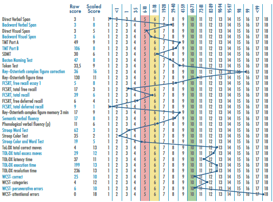 Attention: Direct Verbal Span, Direct Visual Span, Trail Making Test (TMT) Part A and B, Symbol Digit Modalities Test (SDMT), Stroop Color and Word Test, Wisconsin Card Sorting Test (WCST) attentional function. Language: Boston Naming Test, Token Test, Semantic and phonological verbal fluency (p). Memory: Colombian version of the Free and Cued Selective Reminding Test (FCSRT) free recall essay 1, total free recall, total recall, free deferred recall, total deferred recall, Rey-Osterrieth complex figure memory 3 minutes. Building skills: Rey-Osterrieth complex figure correction, Rey-Osterrieth figure time. Executive functions: Backward Verbal Span, Backward Visual Span, TMT B, Phonological Verbal Fluency, (p) Token Test, Stroop Interference Test, Tower of London (ToL-DX) total correct moves, excess moves, latency time, execution and resolution, correct Wisconsin Card Sorting Test (WCST), categories, perseverative errors.